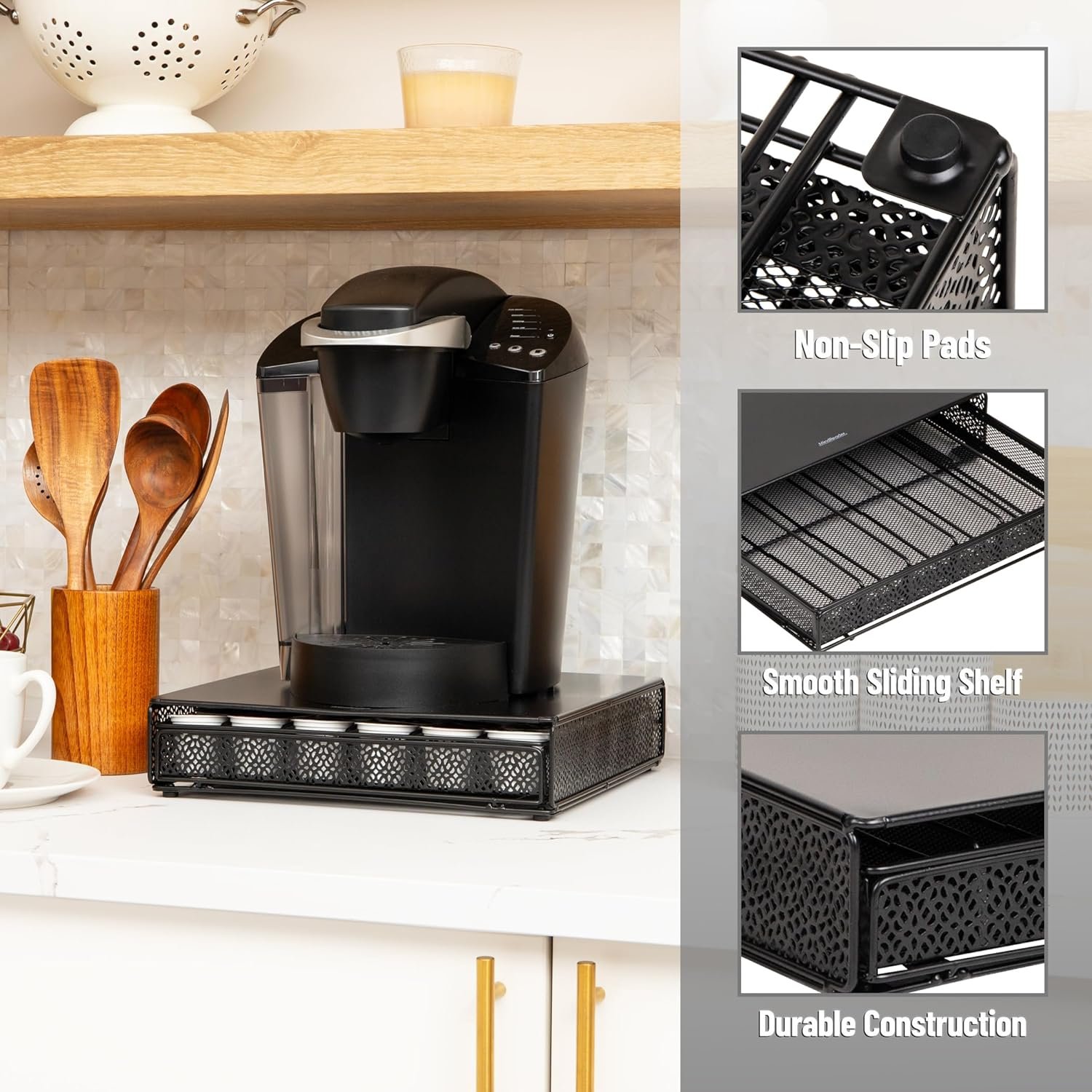 • Durable Metal Construction: Solid metal pod holder supports most single-serve brewers, making it ideal for daily countertop storage.