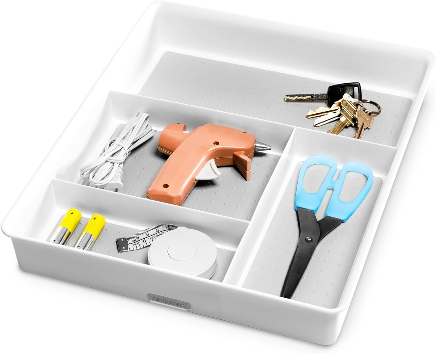 The drawer organizer from madesmart is an all-in-one solution designed to organize cluttered kitchen, office, or utility drawers effortlessly. With a clean white design and four generously sized sections, this product creates instant order out of chaos.