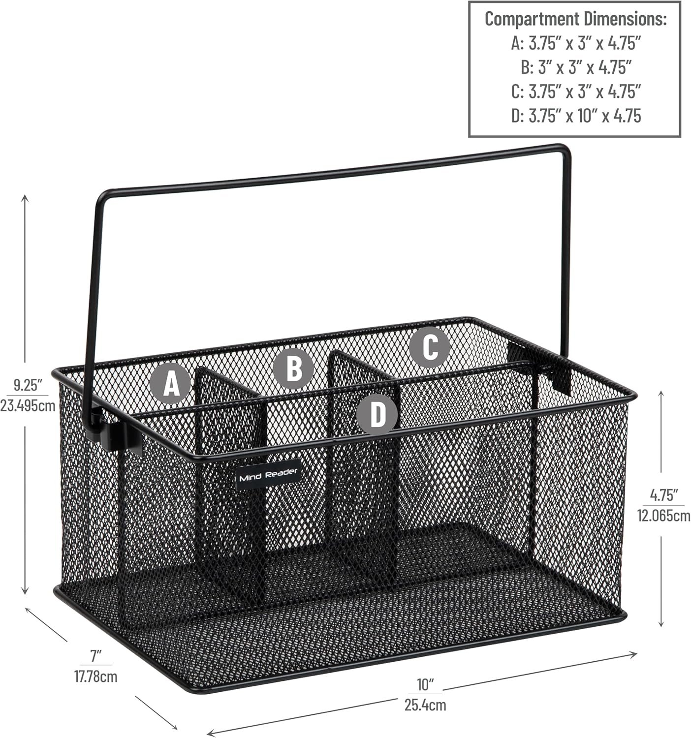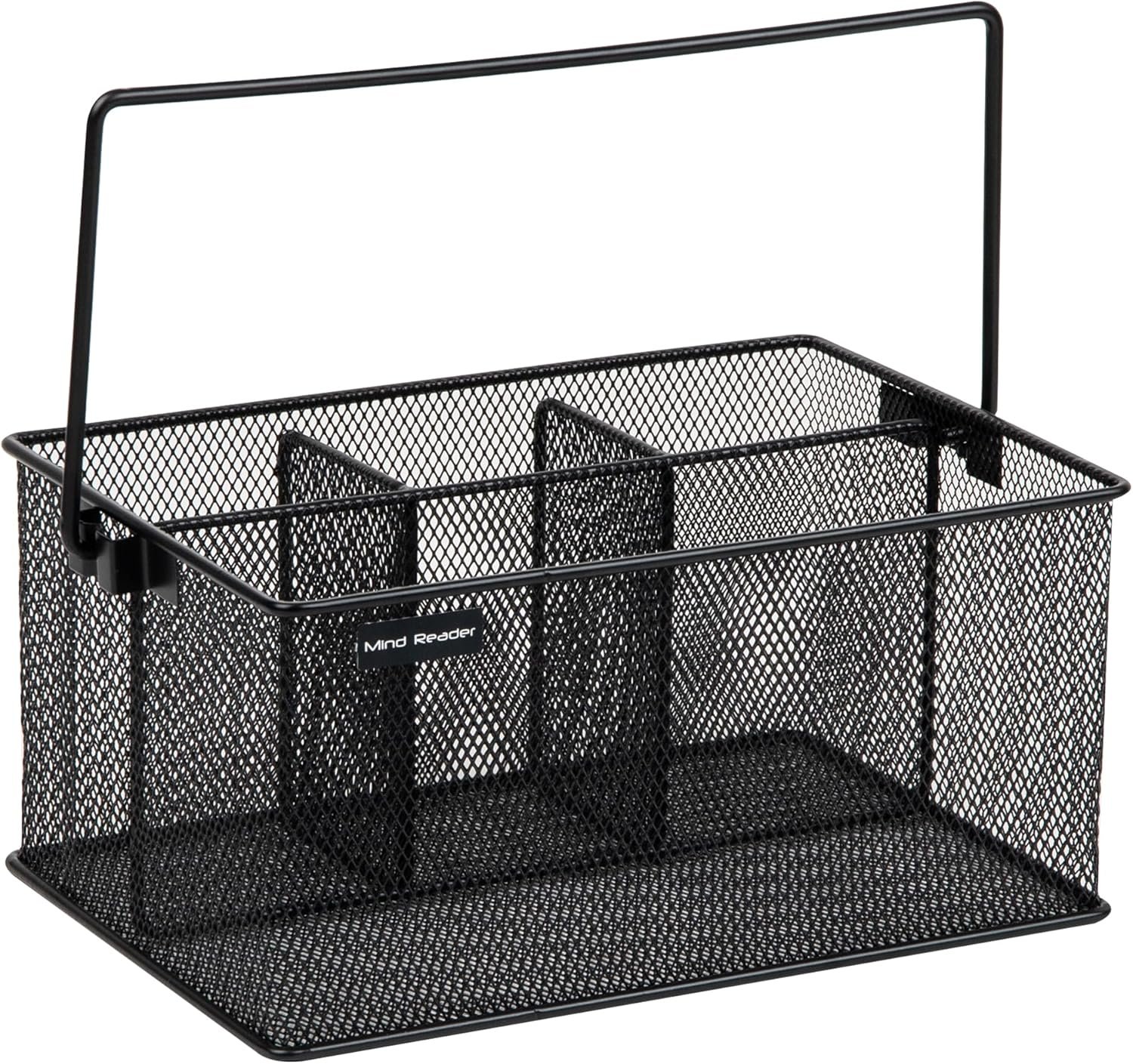 The Mind Reader Utensil Holder by Mind Reader Store is a durable and portable metal mesh caddy with four compartments, perfect for keeping your kitchen utensils or art supplies organized and hygienic. Its compact, easy-to-clean design with a convenient handle makes it an essential space-saving storage solution for any home or workspace.